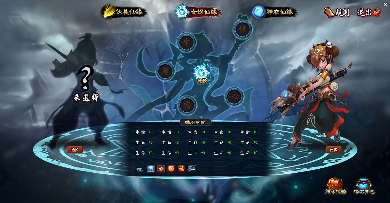 2.结缘系统共有3种仙缘,每种仙缘有5个缘石格子,对应为生缘、尘缘、情缘、宿缘、心缘,需要通关对应的PVE(缘劫之谷)解锁。